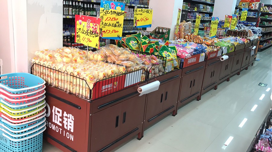 雖然只能單面陳列商品,但是它還能起到裝飾墻面的作用,一般用于陳列零食、飲料、面包等商品。